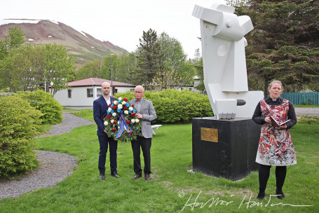 Mynd dagsins - Blómsveigur lagður að minnisvarða um látna sjómennMynd dagsins - - Lestrar 638