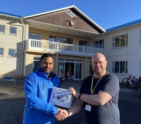 Daniel Annisius, astoarframkvmdastjri Gentle Giants afhendir Hjlmari Boga, deildarstjra, drnann a gjf.
