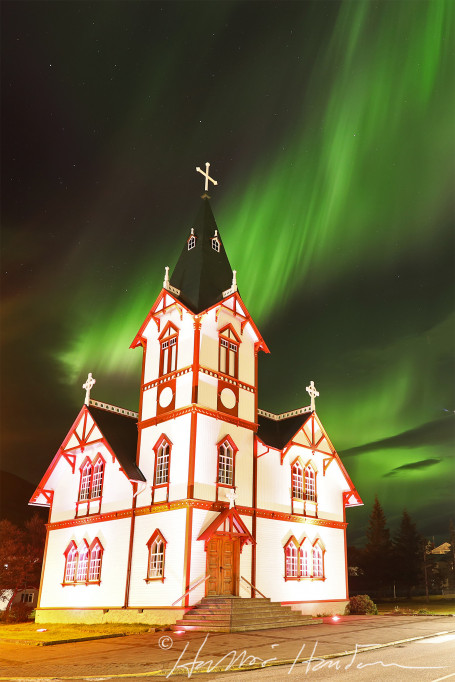 Hn snir Hsavkukirkju baaa norurljsum en norurljsin myndast egar hrafleygar rafhlanar agnir fr slinni rekast atm og sameindir um 100 km h yfir Jrinni.