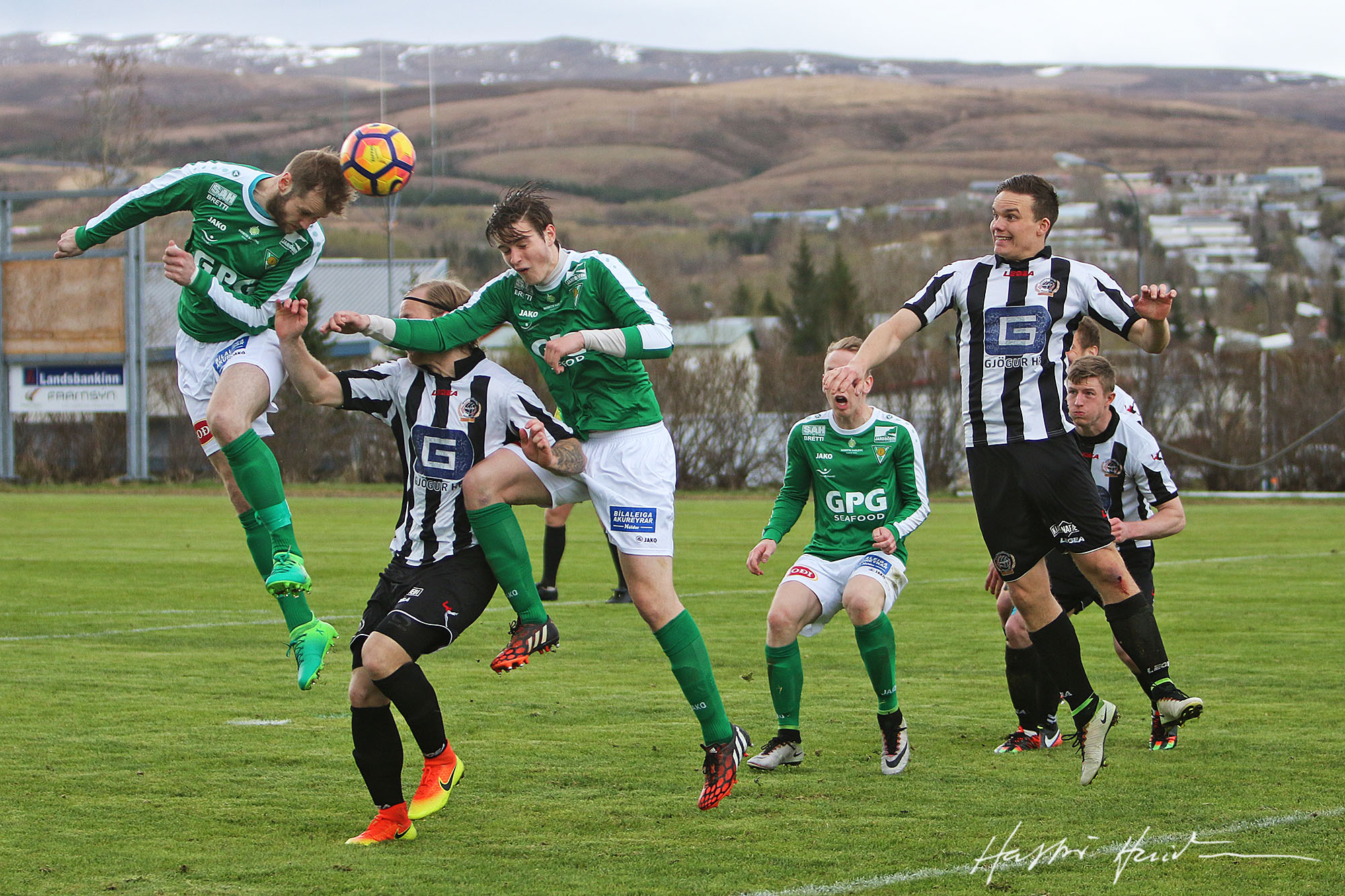Leikiđ var á fagurgrćnum grasvellinum og muna elstu menn vart eftir ađ byrjađ hafi veriđ svona snemma sumars ađ spila á honum.