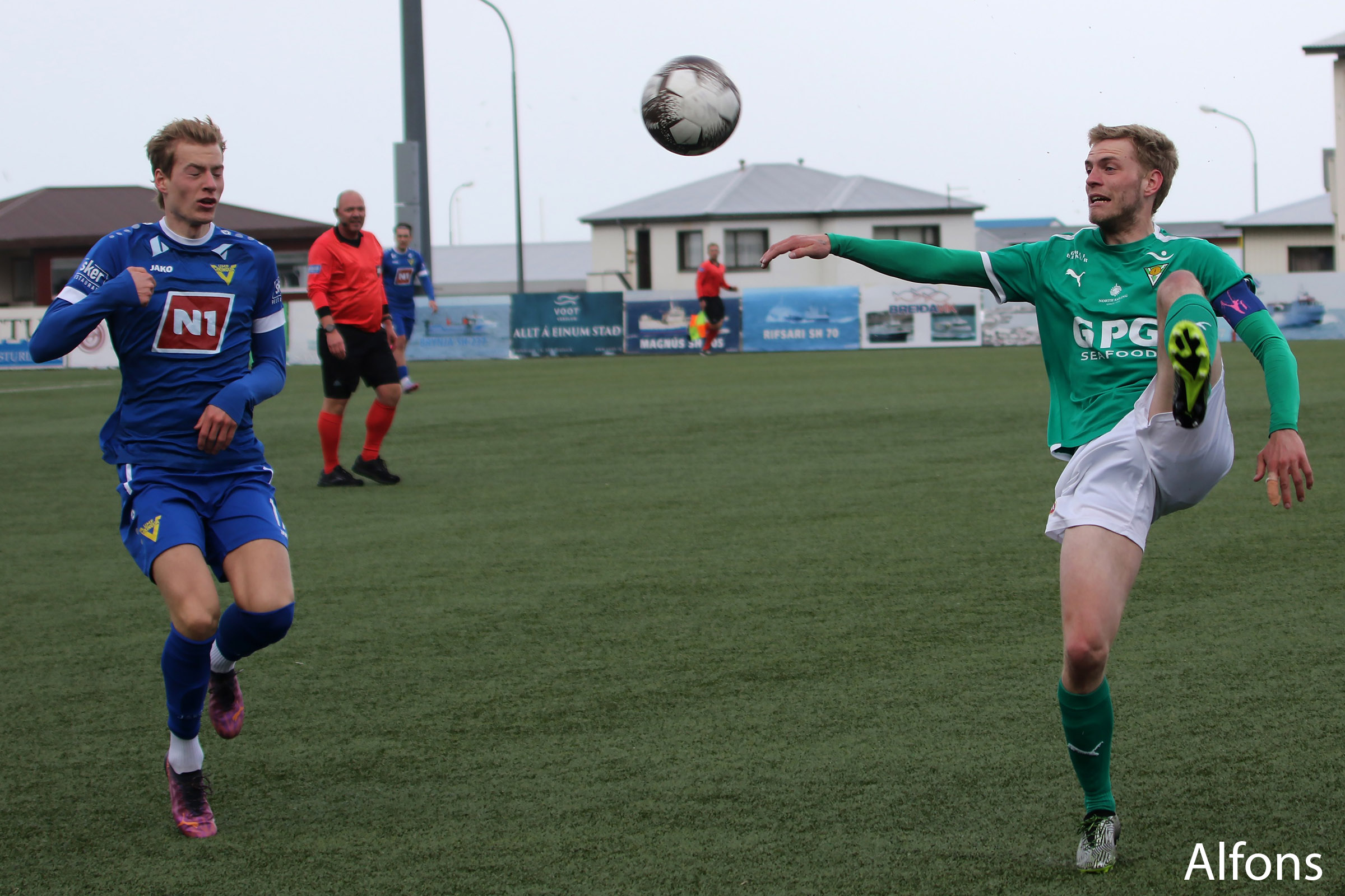 Arnar Pálmi Kristjánsson fyrirliði Völsungs í baráttu um boltann í gær.