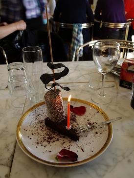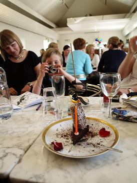 Þær voru svo yndislegar, þær Áslaug og Anna sem reka staðinn, að þær færðu mér afmælistertu með kerti og alles og að sjálfsögðu var sungið með. Og heppin var ég, því þótt ótrúlegt sé þá borða ég ekki marengs, og ég fékk þessa líka fínu súkkulaðitertu með heilli kókosbollu ofan á og lakkrísrúllu; en ég elska einmitt súkkulaði, kókosbollur og alveg sérstaklega lakkrís! Anna Heba og hinir marengssjúklingarnir í hópnum fengu sér hinsvegar marengstertuna Hamingjuský, sem er einkenni staðarins, og ég sá alveg hamingjuskýin í augunum á þeim á meðan þær borðuðu tertuna og lengi vel á eftir - gott ef þau eru þar bara ekki enn!