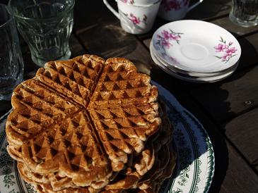 Þegar upp í Mývatnssveit var komið heimsóttum við þar góða vini að sunnan og buðu þeir upp á ekta vöfflukaffi og yndislegheit. Það var að sjálfsögðu setið úti í blíðunni og ekki var það nú amalegt með útsýni beint út á vatn. Þessir góðu vinir bjóða alltaf upp á sælkerafæði þegar þeir eru sóttir heim og ekki klikkuðu vöfflurnar frekar en annað.