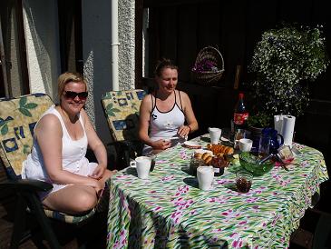 Við byrjuðum daginn á fullkomnum og yndislega óhollum morgunverði í glampandi sól og blíðu á elsku Húsavík. Í boði var t.d. nýbakað tómatbrauð úr Úrval, ýmisskonar ostar og sultur, nýbökuð mini-crossant, kók og kaffi; lúxusmorgunverður hjá drottningunum og nutum við hans alveg í tætlur.